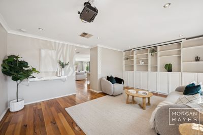 From the moment you step inside, you're greeted by a spacious front living room finished with warm timber flooring, built-in shelving and cabinetry, and a projector setup, creating the perfect space for movie nights or relaxed family living. Ducted evaporative cooling, LED downlights, and electric roller shutters to the front windows add both comfort and security.