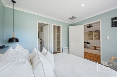 The generously sized master suite is positioned privately at the front of the home and features carpeted flooring, electric roller shutters, stylish hanging bedside lights, USB power points, and a walk-in robe with built-in shelving. The modern ensuite is complete with a rainfall shower, single vanity with storage, circular feature mirror, and toilet, while a Rinnai electric wall heater and evaporative cooling vent ensure year-round comfort.
