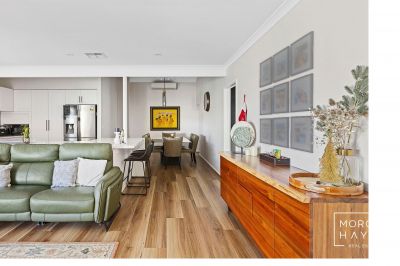 Moving through to the heart of the home, the open plan living, dining and kitchen area is generous in size and designed for everyday family living. This space connects seamlessly with the kitchen, where 40mm stone benchtops, quality appliances including a Bosch dishwasher, ASKO gas cooktop and pyrolytic Westinghouse oven, ample storage and a large fridge recess make both cooking and entertaining a pleasure. Direct shopper's entry from the garage adds everyday convenience.