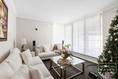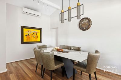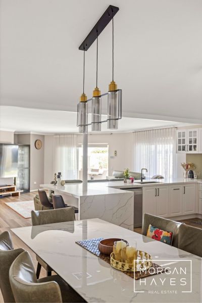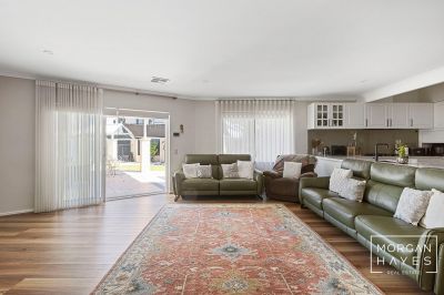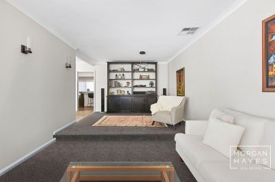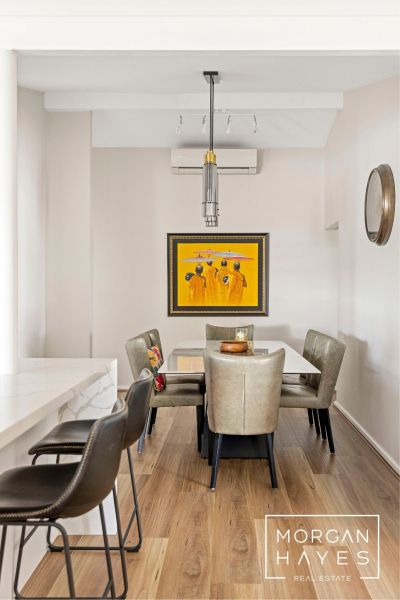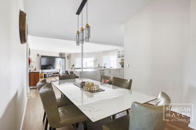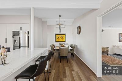 The entry sets the tone with stylish hybrid plank flooring, a feature chandelier and a sense of warmth that flows throughout. To the front of the home, a sunken formal lounge with plush carpeting and a step-up dining space creates a lovely area to relax or entertain, enhanced by corner windows, feature wall lighting and ducted reverse-cycle air conditioning for year-round comfort.